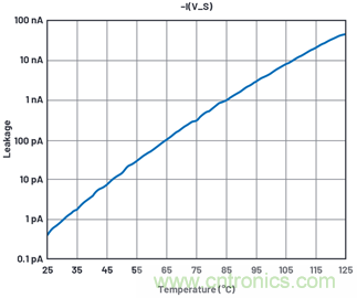 數(shù)據(jù)手冊曲線顯示25°C時與電壓相關(guān)的pA級漏電流,但數(shù)據(jù)手冊規(guī)格只能保證幾百pA。我受25°C下曲線結(jié)果的影響更大。對于此器件,沒有正確把握小漏電流的重要性,所以無法保證測試結(jié)果??陀^地說,測量一個pA級漏電流需要大量的設(shè)計開發(fā)工作和較長測試時間。