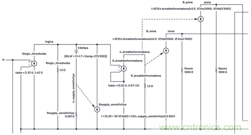 我們還需要說明另一個特性。請注意,在圖20中,更高的電源電壓會縮短延遲時間。這通過B_supplysensitivitya來實現(xiàn),它向Cdelaya返回自身隨VDD變化的少量動態(tài)電流。Rsupply_sensitivitya因為Cdelaya電流會出現(xiàn)少量壓降,使得Cdelaya很大程度上作為純電容使用。將Cdelaya電流的副本返回給Cdelaya實際上會創(chuàng)建一個可控 的可變電容器,Bsupply_sensitivitya內(nèi)部的數(shù)學(xué)運算實際上會產(chǎn)生圖20所示的延遲與VDD關(guān)系曲線。