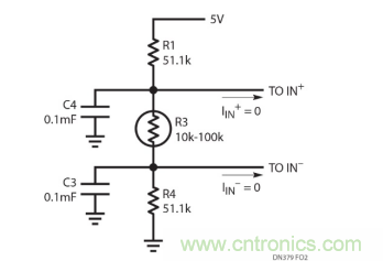 圖 2 顯示怎樣平衡熱敏電阻器,以便最大限度減小 ADC 輸入電流。如果基準(zhǔn)電阻器 R1 和 R4 是準(zhǔn)確相等的,那么輸入電流為零,不產(chǎn)生誤差。如果基準(zhǔn)電阻器的容限為 1%,那么由于共模電壓的輕微漂移,所測(cè)得電阻的最大誤差為 1.6Ω,遠(yuǎn)遠(yuǎn)小于基準(zhǔn)電阻器本身 1% 的誤差。這個(gè)解決方案無需放大器,從而非常適合微功率應(yīng)用。