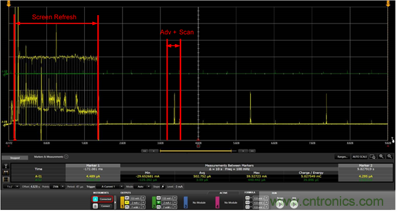圖11顯示了在160 uA(平均)水平的總功耗數(shù)值,在與上述相同的條件下,不包括屏幕刷新事件。