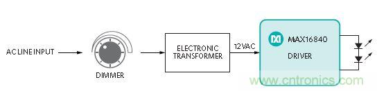 Maxim的MAX16840LED驅(qū)動器采用擁有專利的固定頻率、平均電流模式控制方法,解決了這一問題,并且也兼容絕大多數(shù)電子變壓器和后沿調(diào)光器。
