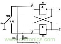 為了消除開關(guān)的接觸抖動(dòng),可在機(jī)械開關(guān)與被驅(qū)動(dòng)電路間接的接入一個(gè)基本RS觸發(fā)器,如圖1所示。S為=0,R=l,可得出A=l,A‘=0。當(dāng)按壓按鍵時(shí),S=l,R=0,可得出A=0,A’=1,改變了輸出信號(hào)A的狀態(tài)。若由于機(jī)械開關(guān)的接觸抖動(dòng),則R的狀態(tài)會(huì)在0和1之間變化多次,若R=l,由于A=0,因此G2門仍然是“有低出高”,不會(huì)影響輸出的狀態(tài)。同理,當(dāng)松開按鍵時(shí),S端出現(xiàn)的接觸抖動(dòng)亦不會(huì)影響輸出的狀態(tài)。因此,圖1所示的電路,開關(guān)每按壓一次,A點(diǎn)的輸出信號(hào)僅發(fā)生一次變化。