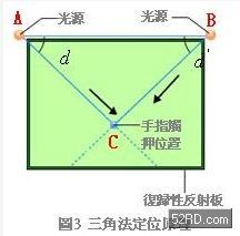 大型觸控面板採「光線遮蔽方式」,圖3是光學式大型觸控面板應用三角法定位原理的動作原理,如圖所示,若知道A-B之間的距離、A點的夾角d,以及B點的夾角,就能夠確定C點的位置,A-B之間的距離為已知數(shù),只要確定A點的夾角與B點的夾角即可。