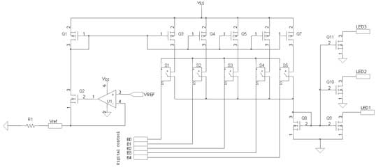 為了在LED中實(shí)現(xiàn)精確及穩(wěn)定的正向偏置條件,通過與帶隙參考提供的恒定電壓相關(guān)的外部電阻產(chǎn)生一個(gè)參考電流。與運(yùn)算放大器U1相關(guān)的晶體管Q1在Vref引腳產(chǎn)生恒定輸出電壓。Vref和地之間連接的外部電阻產(chǎn)生流經(jīng)Q1和Q2的恒定電流。這個(gè)電流這時(shí)候就被Q3~Q7的晶體管系列建立鏡像和放大,每個(gè)電流被連接至開關(guān)S1~S5,并且被晶體管Q8相加。最后,晶體管Q9復(fù)制參考電流至LED1。這種結(jié)構(gòu)針對(duì)每個(gè)LED進(jìn)行復(fù)制,而芯片的布局經(jīng)仔細(xì)分析,以優(yōu)化每個(gè)LED之間的匹配。