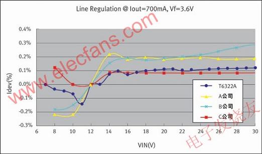 圖1對T6322與其它產(chǎn)品的功率轉(zhuǎn)換效率進(jìn)行了對比。圖2是T6322與其他產(chǎn)品的線路調(diào)整能力的對比(低電流變動率即表示高線路調(diào)整能力)。
