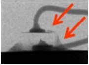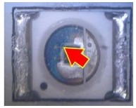2. 變色:這類失效是指LED不點(diǎn)亮的狀況下,外觀顏色或膠材透明度與新品不同,用肉眼即可看出,通常在產(chǎn)品使用一段時(shí)間或在做完可靠度試驗(yàn)后發(fā)生。一般說(shuō)來(lái),變色區(qū)域大致可區(qū)分為發(fā)生在導(dǎo)線架或封裝膠材兩類,若發(fā)生在導(dǎo)線架,通常是因?yàn)楸砻媾c環(huán)境中的化學(xué)物質(zhì)發(fā)生反應(yīng),如氧化或硫化,要分辨屬于哪種需仰賴成份分析,可使用的儀器包含有EDS(Energy Dispersive X-ray Spectroscope)、XPS(X-ray Photoelectron Spectrometer)、AES(Augur Electron Spectroscope)等等。若是封裝用的膠材發(fā)生變色,則屬于高分子材料的劣化現(xiàn)象,如環(huán)氧樹(shù)脂易受高溫或是紫外光影響而變黃,因此白光LED多改采矽膠取代之。分析此類失效應(yīng)特別留意,因膠材本身有一定的透明度,有時(shí)變色的導(dǎo)線架因被膠材蓋住而誤判為膠材變色,引導(dǎo)至錯(cuò)誤的改善方向。