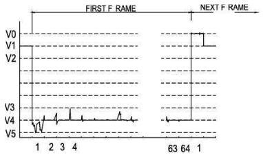 以輸出B形波的芯片的COM線為例。在沒有加電容之前選擇點(diǎn)和半選點(diǎn)的電壓波形都有畸變,畸變嚴(yán)重時(shí)會(huì)造成串?dāng)_影響顯示對(duì)比度,波形如圖2所示。增加電容后,波形會(huì)得到很大的改善,波形如圖3所示。