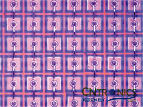 矩陣式LED工藝步驟包括材料準備、芯片的取放、脈沖回流、清潔、引線鍵合及測試。下面的討論將主要集中在脈沖回流(低溫共晶鍵合)和引線鍵合步驟。示例為9 8的290祄LED矩陣,采用AuSn粘合法。LED在列方向被電氣連接在一起。目的是利用冶金共晶互連將LED和基板連在一起,根據(jù)部件容差(約 1mil的空隙)將LED盡可能緊密地布置。圖2所示為該290祄LED矩陣。