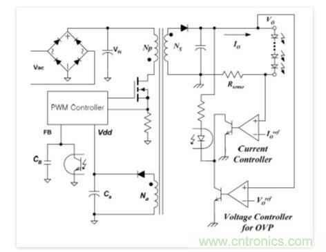 傳統(tǒng)上,用于LED的恒流LED驅(qū)動(dòng)使用隔離反激式轉(zhuǎn)換器實(shí)施,該轉(zhuǎn)換器具有輸出電流調(diào)節(jié)電路,如圖1所示。實(shí)際LED電流使用感測(cè)電阻測(cè)量,然后與與參考電壓進(jìn)行比較,生成誤差電壓。誤差電壓通過(guò)光電耦合器傳輸?shù)匠跫?jí)端,并用于控制初級(jí)端開(kāi)關(guān)器件的占空比。雖然這可以實(shí)現(xiàn)卓越的LED電流調(diào)節(jié),但輸出調(diào)節(jié)電路要求使用光電耦合器、基準(zhǔn)電壓以及感測(cè)電阻,從而增加系統(tǒng)成本并降低整體效率。