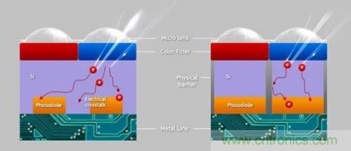 發(fā)布會上,蘋果特意強調(diào)iPhone 6s使用了“Deep trench isolation”,亦即“深槽隔離”技術(shù)來改善畫質(zhì)。