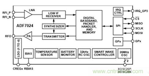 圖7:工作頻率低于1GHz的Analog Devices ADF7024低功耗收發(fā)器為5 mm× 5 mm IC,用于431 MHz至435 MHz及862 MHz至 928 MHz的免許可(但仍受法規(guī)約束)ISM頻段,適合智能家居和樓宇中的各式各樣本地傳感器。