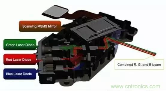 紅、藍(lán)和綠色激光二極管與 MEMS掃描鏡集成在一起形成一個(gè)緊湊的彩色顯示引擎。其中,掃描鏡系統(tǒng)在設(shè)計(jì)中使用了MEMS和小型激光器。