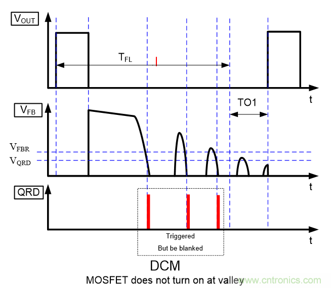 4. 如果QRD信號在TFL結(jié)束前都沒有觸發(fā),等TO1時間結(jié)束后MOS直接導通,如圖四(c)所示。