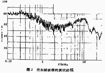 我們知道,架空的輸電線上不可避免地會(huì)檢拾到各種高頻輻射干擾,這種干擾往往以共?;虿钅P问匠霈F(xiàn),從而在電源線上產(chǎn)生傳導(dǎo)干擾,通過正確的接地,可以抑制這種干擾,但只是在一定程度上的改善,因而可以加濾波器予以抑制(見測(cè)試曲線)。