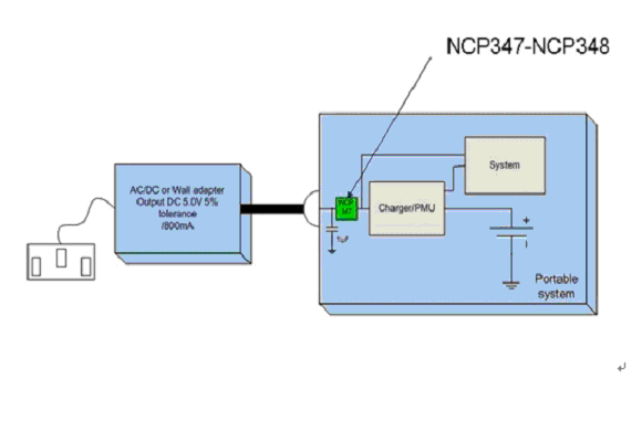 OVLO所定的電平必須高于AC-DC的最大輸出工作電壓并低于系統(tǒng)首個元件的最大額定電壓。圖1所示為一個基于全集成OVP器件的典型便攜式設備的結構(此處的OVP采用的是NCP347MTAE)。