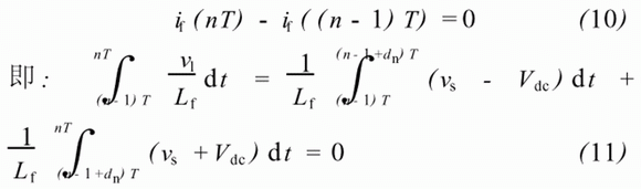 單相電壓源型有源濾波器直流側(cè)以電容作為儲(chǔ)能元件來維持直流電壓Vdc恒定。設(shè)開關(guān)周期恒定為T,第n個(gè)開關(guān)周期內(nèi)占空比為dn,則這個(gè)開關(guān)周期內(nèi)兩對(duì)開關(guān)管分別導(dǎo)通的時(shí)間為dn*T和(1-dn)*T,從而分別可以得到兩個(gè)電壓平衡方程: