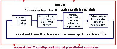 第一步驟計(jì)算隨機(jī)選擇的通態(tài)電壓下的均流。在接下來(lái)的模擬步驟中,程序?qū)⒃诿總€(gè)模塊計(jì)算得到的電流中加上開(kāi)關(guān)損失。隨后,通過(guò)將進(jìn)一步計(jì)算得到的損失與模塊的Rth相乘得到結(jié)溫。