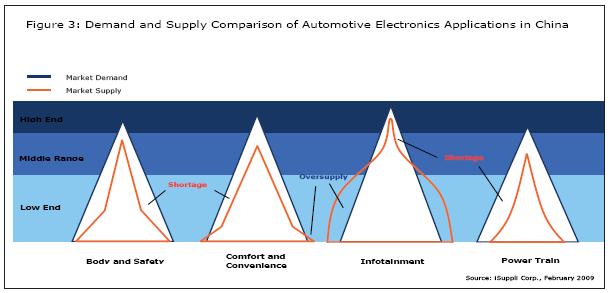 中國汽車電子市場并不成熟,各種應用在以不同的速度發(fā)展。在某些領(lǐng)域,如低端信息娛樂領(lǐng)域,產(chǎn)品過剩情況非常普遍。與此同時,在多數(shù)其它領(lǐng)域,仍然是供不應求,有時供應缺口還很大。對于中國汽車電子產(chǎn)業(yè)中的后來者,重要的是找到競爭不太激烈的市場領(lǐng)域或者產(chǎn)品種類。在供應缺口較大的領(lǐng)域,市場形勢會比較有利,而潛在的利潤也會較高。