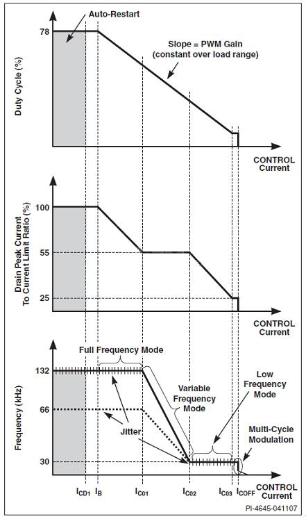 在高負載條件下,TOPSwitch-HX控制器工作于全頻PWM模式,此時用戶既可使用尺寸較小的元件,又可實現(xiàn)高效率。隨著負載的降低,控制器也降低頻率,從而降低開關損耗。它先切換到變頻模式,然后切換到頻率較低的固定頻率PWM模式。當負載極輕時,控制方式從PWM控制模式開始切換,并采用多周期調制控制算法。TOPSwitch-HX能根據(jù)經(jīng)由光耦器饋入到控制引腳的反饋電流(圖1),自動在各控制模式間切換。
