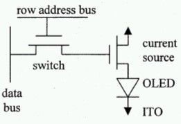 OLED像素的導(dǎo)通和尋址是由主動(dòng)開關(guān)控制,這個(gè)開關(guān)則由薄膜晶體管擔(dān)任,它的制造技術(shù)和TFT液晶顯示器完全相同:電流源已經(jīng)簡(jiǎn)化到只需要一個(gè)MOSFET與OLED串聯(lián)。有些設(shè)計(jì)會(huì)使用電壓驅(qū)動(dòng)架構(gòu),有些則采用電流驅(qū)動(dòng)架構(gòu),所有設(shè)計(jì)都需要二至四顆,甚至更多的整合式薄膜晶體管。