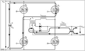 兩個互為對角的全橋開關(guān)不是同時驅(qū)動,而是通過相移的方法在啟動命令之間引入預定義的短期延遲。這種延遲由控制電路的電壓回路進行調(diào)節(jié),從而在兩個驅(qū)動信號之間產(chǎn)生相移。這種相移技術(shù)的特殊之處在于,它可啟動兩個與變壓器串聯(lián)的開關(guān),而變壓器的電壓卻為零。