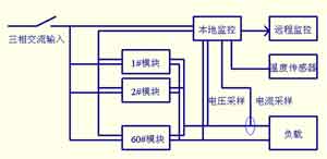 大功率電動汽車充電機的輸入為額定線電壓380V、50Hz的三相交流電,輸出額定電壓700V,額定電流600A。系統(tǒng)采用19"標準機架,結(jié)構(gòu)緊湊、布局合理、外型美觀大方。外型尺寸:高×寬×深為2200mm×600mm×600mm。采用60個模塊并聯(lián),每個模塊10A/700V,模塊尺寸:高×寬×深為133mm×425mm×270mm,15層4列,分四個柜體安放,四個柜體可分開運輸,使用時緊湊左右排列。機架前門、后門均為雙開門,方便檢修。電源進線和匯流排輸出位置均在底部輸入。電源輸入斷路器及監(jiān)控單元觸摸屏安裝在主機中間控制柜前部。充電機控制結(jié)構(gòu)示意圖如圖2所示。
