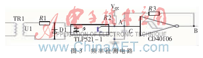 單片機對常用和備用電源進行頻率檢測,根據(jù)檢測的結(jié)果來判斷電源是否發(fā)生故障,然后進行相應(yīng)的控制操作。頻率檢測電路主要以光耦TLP521-1和施密特觸發(fā)器CD40106為主要器件構(gòu)成。頻率檢測的硬件電路如圖3所示。電網(wǎng)中的交流電經(jīng)變壓器后變換為電壓較低的交流信號U1,U1經(jīng)過光耦TLP521-1后就變成了同頻率的方波信號。為了防止光耦內(nèi)部的二極管被反向電流擊穿,在光耦外部反向接了1個二極管。為了使光耦輸出的方波信號更加規(guī)整,為單片機測量頻率做好準備,在光耦的輸出級加了施密特觸發(fā)器CD40106。利用PIC16F884單片機的輸入捕捉(CCP)功能記錄第一個上升沿的時間t1和下一個上升沿的時間t2,則信號的周期T=(t2-t1)μs。為了提高測量的精度,采用多次測量取平均值的方法來實現(xiàn)。