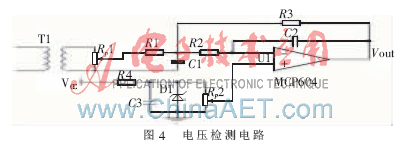 電壓檢測主要用來實時檢測常用和備用電源的電壓。PIC16F884單片機有14通道的10位A/D轉(zhuǎn)換器,可以滿足電壓采樣的精度。由于PIC16F884單片機只能對0~5V間的單極性電壓進行檢測,故需要對交流電壓進行提升使它成為單極性的電壓信號。電壓檢測電路如圖4所示[1]。