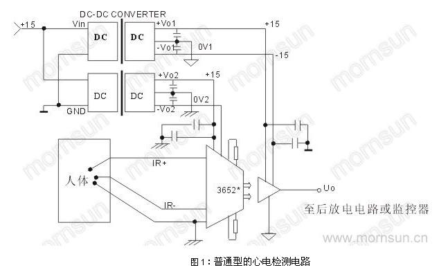 如圖,此電路是由ISO122與INA115等組成的人體心電檢測(cè)電路,該電路完全可達(dá)到醫(yī)療器械使用要求,即輸入阻抗低、漏電流小、檢測(cè)精度高和人體安全等指標(biāo); 輸出信號(hào)由ISO122隔離傳輸?shù)胶笾梅糯箅娐?,?shí)現(xiàn)人體信號(hào)與輸出及電源的隔離放大, 采用隔離型DC-DC模塊供電可有效非曲直抑制周圍環(huán)境的電磁干擾和消除接地環(huán)路等。