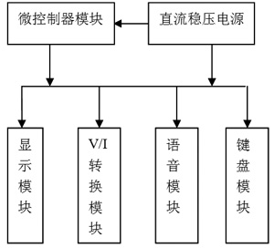 本設(shè)計采用單片機作為主要控制部件,通過鍵盤預(yù)置輸出電流值并采用液晶模塊實時顯示。整個系統(tǒng)硬件部分由微控制器模塊、電壓-電流轉(zhuǎn)換模塊、鍵盤模塊、顯示模塊、直流穩(wěn)壓電源模塊和語音提示模塊組成。系統(tǒng)結(jié)構(gòu)框圖如圖1所示。