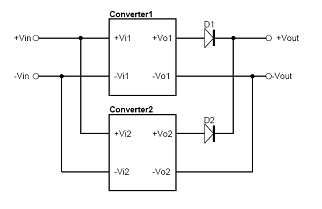 圖3-2為使用Decoupling Diode方式的輸出并聯(lián)應(yīng)用方式,其方式為在二組電源模塊的輸出端,分別串接上二極管,再并聯(lián)使用。
