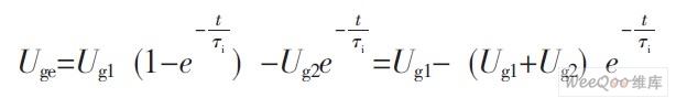 二極管D1導(dǎo)通時(shí), 若Uge為所加的反向電壓值(可記為-Ug2, 正向電壓記為+Ug1), 集電極電流iC=0, Uce=U2。開通后, U1向Cgc、Cge充電, 此時(shí)Uge可寫成: