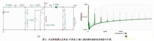 只要加入L2及C2,波形便會變成正弦曲線,而能量會重新調(diào)整為相當(dāng)?shù)偷母哳l率峰值。不過,如果不能正確設(shè)計輸入濾波器,則會將噪聲放大而使得控制回路不穩(wěn)定。因此,了解濾波器設(shè)計的概念,對于優(yōu)化濾波器回波及成本相當(dāng)重要。使用SPICE的AC分析是有效了解濾波器行為的工具。