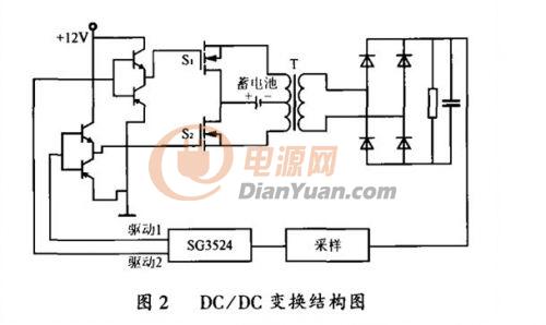 由于變壓器原邊電壓比較低,為了提高變壓器的利用率,降低成本,DC/DC變換如圖2所示,采用推挽式電路,原邊中心抽頭接蓄電池,兩端用開(kāi)關(guān)管控制,交替工作,可以提高轉(zhuǎn)換效率。而推挽式電路用的開(kāi)關(guān)器件少,雙端工作的變壓器的體積比較小,可提高占空比,增大輸出功率。
