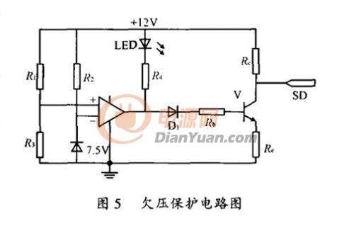 欠壓保護(hù)電路如圖5所示,它監(jiān)測(cè)蓄電池的電壓狀況,如果蓄電池電壓低于預(yù)設(shè)的10.8V,保護(hù)電路開(kāi)始工作,使控制器SG3524的腳10關(guān)斷端輸出高電平,停止驅(qū)動(dòng)信號(hào)輸出。