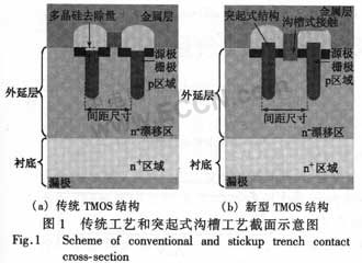 當(dāng)相鄰單位元胞尺寸不斷縮小后,尤其在設(shè)計(jì)柵極氧化膜較薄的器件時(shí),在傳統(tǒng)的TMOS工藝中,源區(qū)注入會(huì)穿透柵極側(cè)壁影響器件性能。采用突起式結(jié)構(gòu)可以有效地避免刻蝕工藝及源區(qū)注入對(duì)較短溝道器件的間接影響,消除了器件穿通的風(fēng)險(xiǎn),保證了器件的穩(wěn)定性能和可重復(fù)性。
