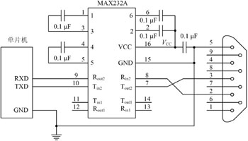 串口是計算機上一種非常通用設備通信的協(xié)議,大多數計算機包含2個基于RS232的串口,PC的串行口是RS232C電平,而單片機的串行口是TTL電平,兩者之間通過串口通信時,必須進行電平轉換,設計運用MAX232A芯片完成單片機與PC之間的數據傳輸,硬件連接電路如圖6所示。
