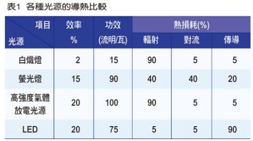在此情況下,約20%輸入功率轉換為光,80%則轉換為熱。這取決于多種因素,發(fā)熱可能與底層不規(guī)則以及聲子發(fā)射、密封、材料等有關。在LED產(chǎn)生的總熱量中,有90%透過傳導傳輸。表1為耗散來自LED接面的熱量,傳導是導熱的主要通道,因為對流和輻射僅占全部熱傳輸約10%。比如一個LED可能轉換近10.72瓦熱量(13.4瓦×0.8)。其中,9.648瓦(10.72瓦×0.9)透過傳導從LED接面?zhèn)鬏敾蜻w移。顯然,LED光源需要精確的功率和熱管理系統(tǒng),因為與其他光源相比,提供給LED的電能大部分轉換為熱量。如果沒有適當?shù)臒峁芾?,這種熱量會影響LED壽命和色彩輸出。同時由于LED驅動裝置屬于硅組件,很快就會失效,因此必須配備故障安全備用過電流保護裝置。