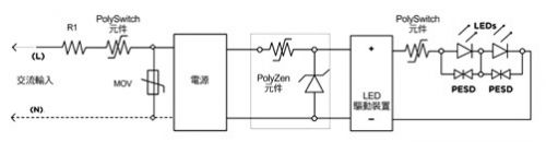 驅動輸出上的PolySwitch組件有助于防止因有害短路或其他負載異常而受損,為了充分發(fā)揮PolySwitch組件的作用,可以與金屬芯電路板或LED散熱片熱接,此外,與LED并置的PESD組件也可以對靜電放電加以保護。