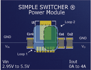 在規(guī)劃電源布局時(shí),首先要考慮的是兩個(gè)開關(guān)電流環(huán)路的物理環(huán)路區(qū)域。雖然在電源模塊中這些環(huán)路區(qū)域基本看不見,但是了解這兩個(gè)環(huán)路各自的電流路徑仍很重要,因?yàn)樗鼈儠?huì)延至模塊以外。在圖1所示的環(huán)路1中,電流自導(dǎo)通的輸入旁路電容器(Cin1),在高端MOSFET的持續(xù)導(dǎo)通時(shí)間內(nèi)經(jīng)該MOSFET,到達(dá)內(nèi)部電感器和輸出旁路電容器(CO1),最后返回輸入旁路電容器。