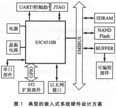圖1是一種典型的嵌入式系統(tǒng)硬件設(shè)計方案。系統(tǒng)的微處理器采用S3c4510B,是基于ARM7體系結(jié)構(gòu)的。SDRAM是一種易失性存儲器作為程序的運行空間,類似于PC機的內(nèi)存;Flash作為程序存儲空間是非易失性的。程序運行過程中的數(shù)據(jù)往往緩存在sDRAM中,在系統(tǒng)失電時必須寫往Flash。