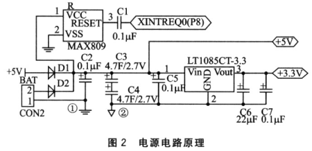 這個電源回路除了可以提供5v和3.3v的電源以外,還為系統(tǒng)掉電保護提供了延時及預(yù)警功能,通過軟件的配合可以實現(xiàn)系統(tǒng)的掉電保護機制。正常情況下,由供電回路1給整個系統(tǒng)供電。當(dāng)系統(tǒng)由于意外原因掉電時,由于輸入的比較電壓降低,這樣MAX809 模塊輸出電壓產(chǎn)生翻轉(zhuǎn)為系統(tǒng)提供掉電中斷預(yù)警信號,中斷請求通過外部中斷引腳XREQ0產(chǎn)生;同時供電回路2開始啟用。通過大電容C3、c4放電,繼續(xù)為系統(tǒng)提供一段供電電壓,支持掉電中斷服務(wù)程序完成。供電回路2只給最小系統(tǒng)供電,并不給耗電量大的外圍部件供電。這樣,給最小系統(tǒng)的供電時間足夠長,可以完成敏感數(shù)據(jù)的保護操作。