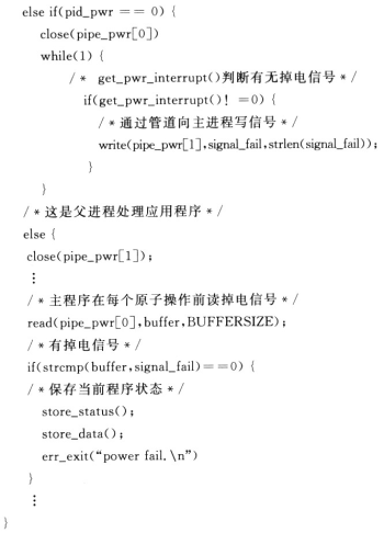 在μClinux系統(tǒng)下,掉電信號的捕捉有兩種方式可以進行。一種是運用系統(tǒng)調(diào)用,即采用void(*signal(intslg,void(*func)(int)))(int)。這個函數(shù)可以為特定的中斷信號安排制訂的執(zhí)行函數(shù),用參數(shù)func傳遞。在μCllnux中,共有31個系統(tǒng)中斷信號,其中掉電信號為SIGPWR。假設(shè)掉電中斷服務(wù)處理程序為void interrupt-service(int),則中斷服務(wù)與信號關(guān)聯(lián)的方式為:signal(SIGPWR,interrupt_service)。這種方式充分利用系統(tǒng)調(diào)用,實現(xiàn)簡單。在掉電保護方案設(shè)計初期也是采用這種機制。但事實證明這種機制并不可靠,其原因是Linux內(nèi)核產(chǎn)生和管理信號的機制并不完善,有可能存在信號丟失。查閱有關(guān)Unix或L1nux的相關(guān)資料,可以發(fā)現(xiàn)這種狀況也普遍存在于某些其他版本的Linux和Unix中。