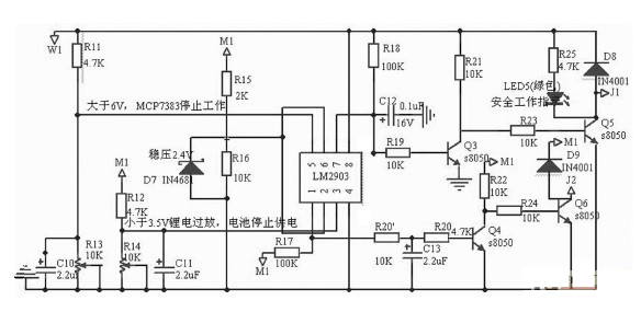 過電壓保護控制,具體電路如圖3所示:整流二極管D4 接過電壓保護繼電器JDQ1輸出。 充電控制管理芯片MCP73831最大輸入電壓為6V. 雖然供電網(wǎng)絡基本輸出電壓為5V,但當光照強度發(fā)生劇烈變化或負載變化較大時,輸出電壓仍然會有一定波動,為保護MCP73831不因短時的電壓波動而損壞,設計了過電壓保護控制器。 當W1 的電壓超過6V, JDQ 1會斷開輸出電路,MCP73831因斷電而得到保護。 具體分析如下:此部分電路設計主要采用了LM 2903電壓比較器和外圍電路擴展而成。 LM 2903包含兩路比較器,1, 2, 3腳為一路, 1腳為OU TPU TA, 2, 3腳為IN PU TA. 5, 6, 7腳為另一路, 7腳為OU TPU TB, 5, 6腳為IN PU TB. 其中過電壓保護控制器用5, 6, 7腳的比較器。電阻R11 , R13分壓后接至比較器的5腳。 當電壓大于6V 即分壓值大于214V. 比較器的7腳輸出電平由低轉為高。 Q3 飽和導通,則Q5 截止,安全工作指示燈熄滅,接點J1為高電平,此時JDQ 1開始工作,供電電路與后續(xù)電路斷開,同時過電壓紅色警示燈亮起。