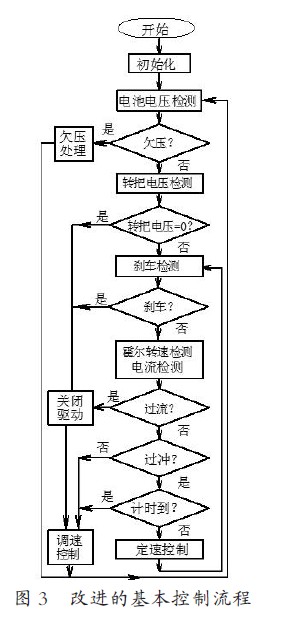 初始化之后,接著檢測電池電壓以判斷是否低電壓,如果低電壓,將起動欠壓保護。如果電池電壓正常,接著接收轉(zhuǎn)把信號以判斷操作者設(shè)定的速度大小,調(diào)整PWM 脈沖的寬度以調(diào)整電動機速度。電動機通電后,控制器接收電流檢測信號、霍爾轉(zhuǎn)速及相序信號、剎車信號等,判斷電動機是否正常運轉(zhuǎn)、電路是否正常工作,動態(tài)輸出PWM 驅(qū)動控制信號,調(diào)整車速使之逐漸達到操作者設(shè)定的速度。在有異常時采取保護措施直至斷開電源。