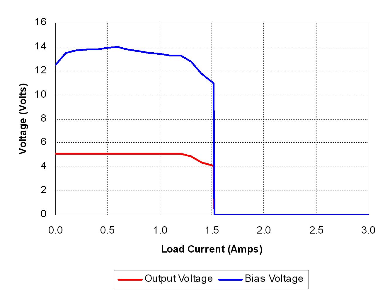 圖3顯示了輸出和偏置電壓與圖2所示電路負(fù)載電流的對(duì)比情況。輸出V-I特性非常接近于圖1所示理想情況。負(fù)載電流達(dá)到約1.3A時(shí)開始功率限制。隨著負(fù)載增加,輸出電壓開始下降。由于偏置電壓是輸出電壓的反映,因此它也開始下降。偏置電壓降至9V關(guān)閉水平以下時(shí),PWM控制器關(guān)閉。