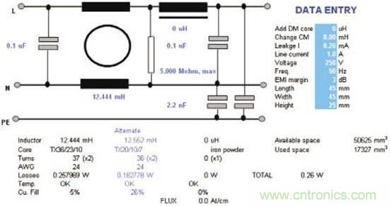 傳導噪聲分析中的共模噪聲、差模噪聲分析,共模阻抗、差模阻抗分析,以及噪聲相位角的測試都是在為最終的解決方案做準備。電子產(chǎn)品滿足傳導發(fā)射的限制要求,最終是通過電源濾波器來實現(xiàn)的。但是如何根據(jù)上述分析結(jié)果快速并準確地確定濾波器中的參數(shù),卻并不是一項簡單的工作。使用特制的濾波器設計軟件,可以將測試數(shù)據(jù)導入專用軟件中,可幫助工程師快速得到針對該產(chǎn)品的定制濾波器。應用方案如圖11。