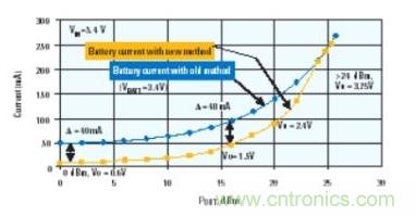 圖3:當功率放大器使用DC-DC轉(zhuǎn)換器供電時,電池電流的節(jié)省情況