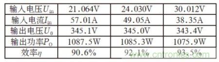 由兩路單端反激并聯(lián)組成的逆變電源前級DC/DC電路(見圖5),輸出功率約1.1kW,試驗結(jié)果如表1所示。