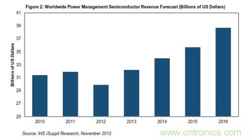 明年該市場(chǎng)將恢復(fù)增長(zhǎng),預(yù)計(jì)上升7.6%至322億美元,略高于去年的水平。對(duì)于電源管理半導(dǎo)體產(chǎn)業(yè)來(lái)說,7.6%的增幅相當(dāng)一般。繼明年之后接下來(lái)的三年,市場(chǎng)將保持溫和增長(zhǎng),2016年?duì)I業(yè)收入預(yù)計(jì)將達(dá)到387億美元,如圖2所示。